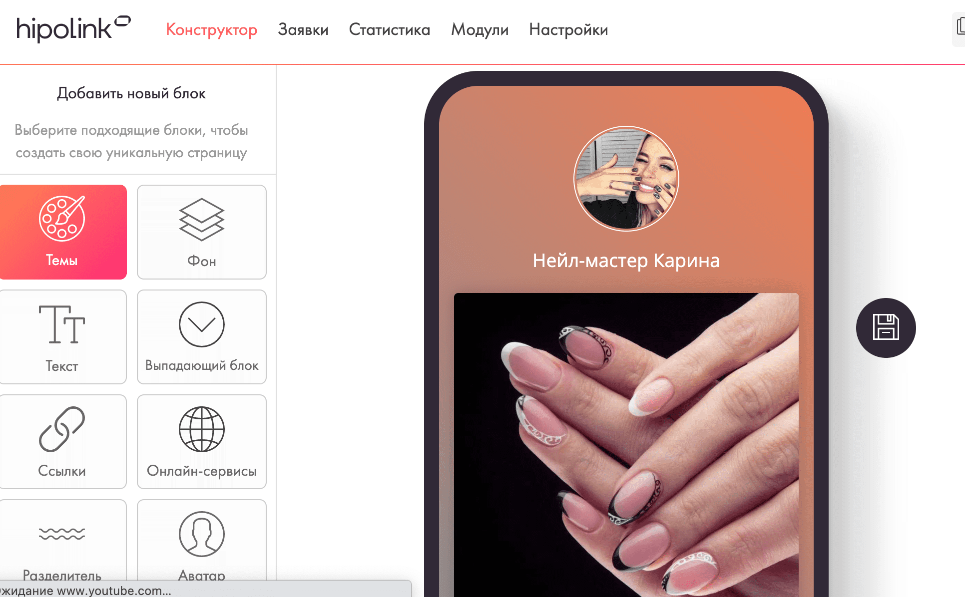 Сайт – это мастхэв любого современного специалиста, предлагающего свои услуги. Его наличие вызывает доверие, свидетельствует о серьёзном подходе к делу. Вы можете заморочиться и привлечь к созданию сайта специалистов, однако это потребует вложений денег и времени, которых у начинающего нейл-мастера нет. Лучше воспользоваться бесплатным сервисом Hipolink, на котором у вас получится быстро собрать одностраничный сайт без сторонней помощи.