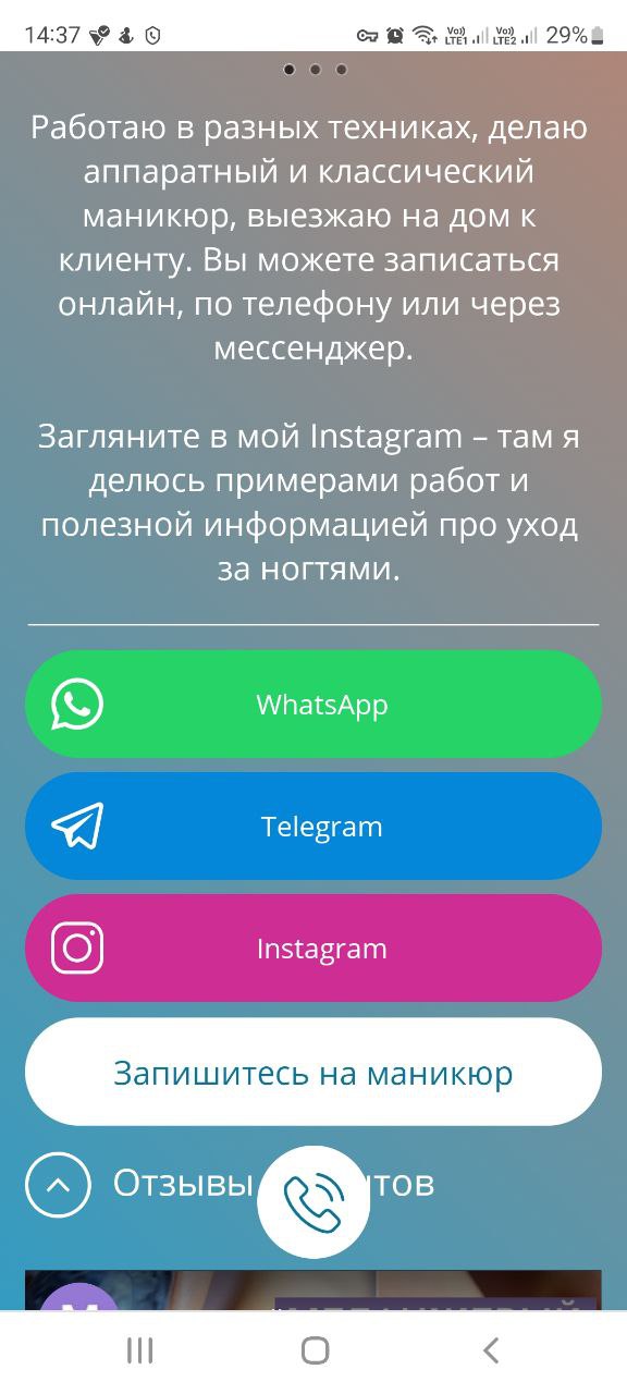 Здесь можно разместить любую полезную для заказчиков информацию: своё портфолио, актуальный прайс, отзывы клиентов, которые обязательно нужно собирать, желательно в письменном виде – через сообщения в мессенджерах и соцсетях. Для удобства клиентов желательно разместить на сайте ссылку на сервис онлайн записи: так вы снимите с себя часть административной работы и обеспечите альтернативой тех, кто не любит записываться по телефону.
