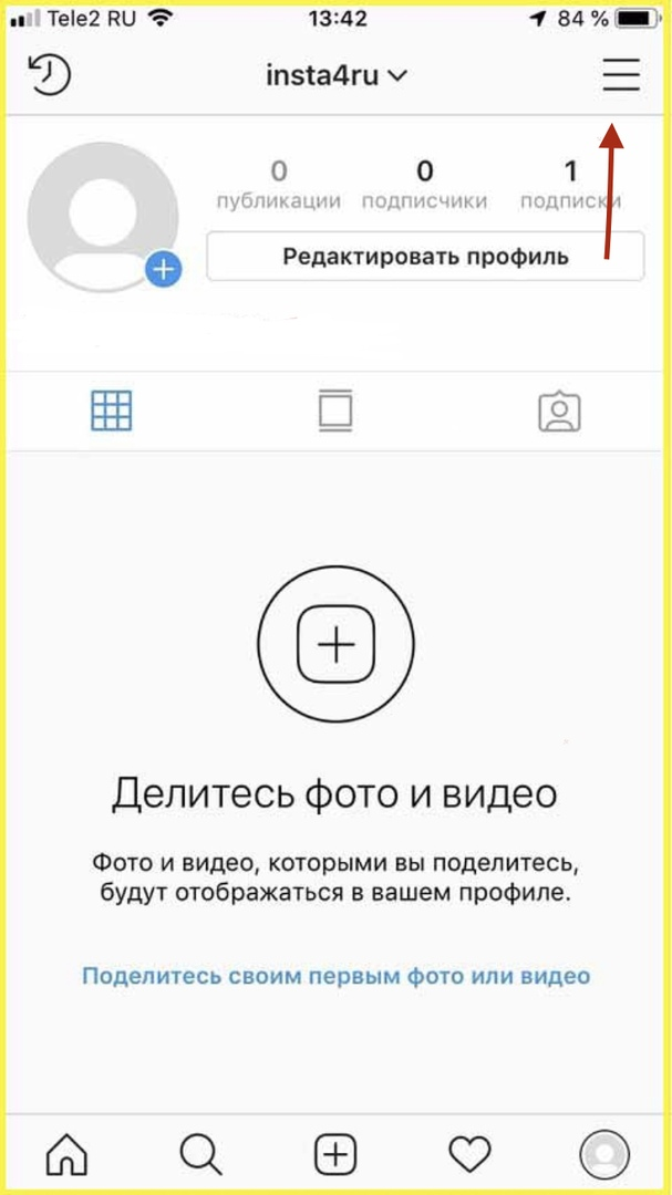 Шаг первый. Зайдите в свой профиль и нажмите в правом верхнем углу на три горизонтальные полосы.
